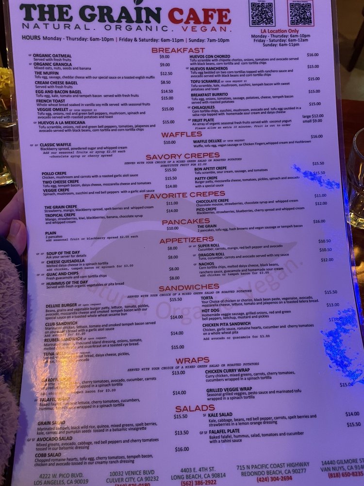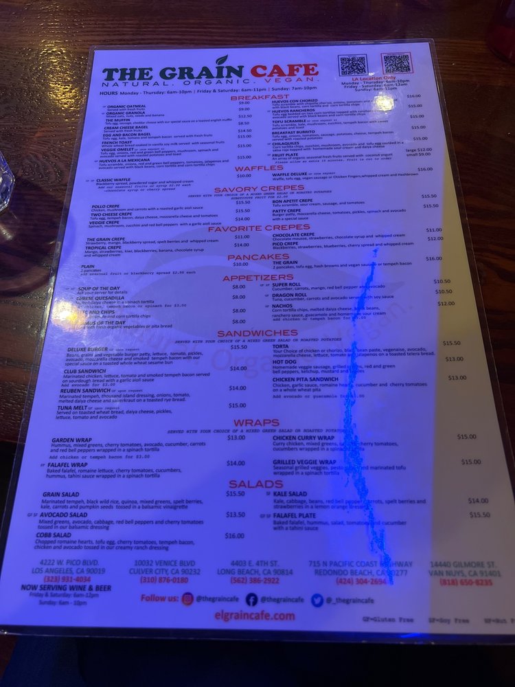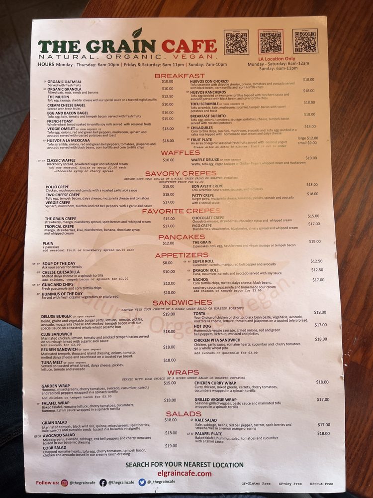 Introducing The Grain Cafe, a vegan haven in Culver City, CA. Offering a diverse menu of wraps, salads, waffles, crepes, and more, this cozy spot provides a range of options for breakfast, brunch, lunch, and dinner. Notable dishes include the Chik'n pita sandwich, falafel wrap, and memorable Tres leches cake. Customers rave about the fresh ingredients, flavorful creations, and attentive service. The ambience is inviting, with a spacious interior perfect for groups. Despite its location in a nondescript strip mall, The Grain Cafe shines with its wide variety of vegan delights and creative takes on classic favorites. For a unique culinary experience that caters to vegans and non-vegans alike, look no further than The Grain Cafe.
