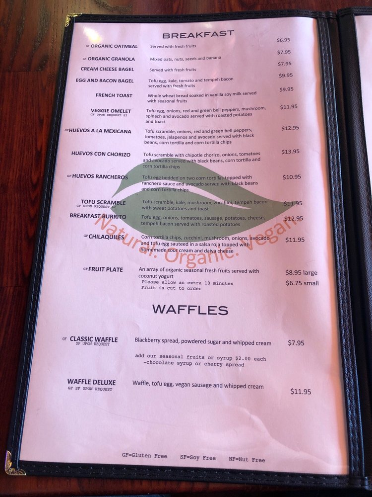 Waffle, tofu, egg, hash browns vegan sausage or chickn finger and whipped cream.