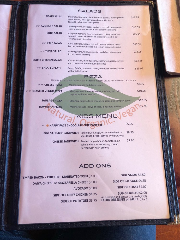 Vegan. 2 pancakes, tofu eggs, hash browns and vegan sausage or tempeh bacon.